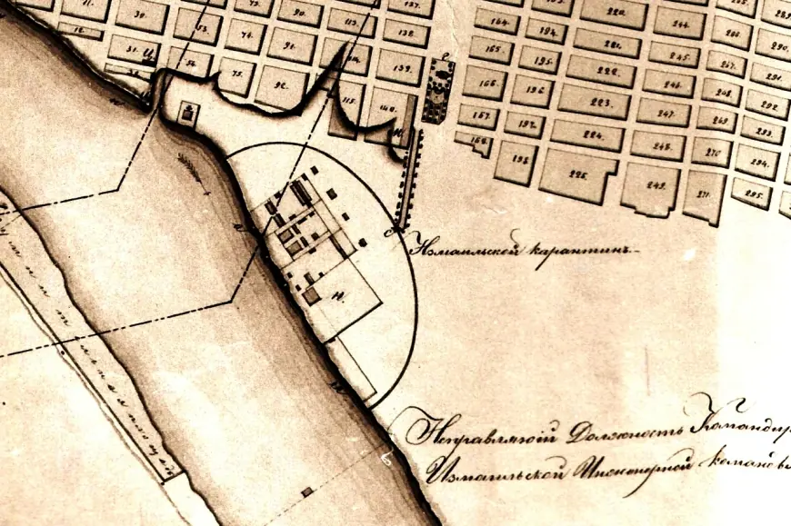 Центральний Ізмаїльський карантин у ХІХ ст. знаходився у прибережній зоні на місці, де нині височіє морський вокзал. Через нього пропускали пасажирів та вантажі, що прибували до міста по Дунаю. Це робилося з метою запобігання проникненню до міста таких небезпечних інфекційних захворювань, як чума та холера. Карантин оточував глибокий рів з дунайською водою, і через нього потрапити у місто можна було дерев'яним містком. Останній знаходився у північній частині і дорогою з'єднувався з Дунайським проспектом (з нинішнім пр. Незалежності/Суворова). На карті нашого міста, датованою 1849 р., він позначений літерою «с» у нижньому правому куті наведеного фрагмента плану.