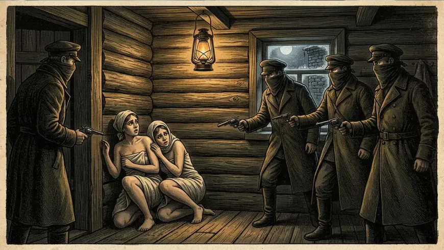 Одного дня за наказом господині прислуга Лукер'я затопила ввечері лазню, де спочатку помилися господарі, а потім відправили прислугу до сусідів Атанасіу, щоб покликати їх доньку Марію в лазню. Коли та прийшла, Лукер'я та гостя роздяглися і почали митися. Незабаром у передбаннику почулися чоловічі голоси. Після цього у банне відділення ввалилися четверо замаскованих чоловіків. Вони направили на переляканих дівчат пістолети і наказали їм мовчати. Зловмисники почали допитуватись у Лукер'ї, чи є у господарів гроші, і де вони зберігаються. Не отримавши від служниці зрозумілої відповіді, троє вийшли з лазні, але одного спільника залишили на варті. Втім, найвищий зі спільників кілька разів поверталася до лазні, щоб дізнатися, де у господарів сокира та ключі від замків.